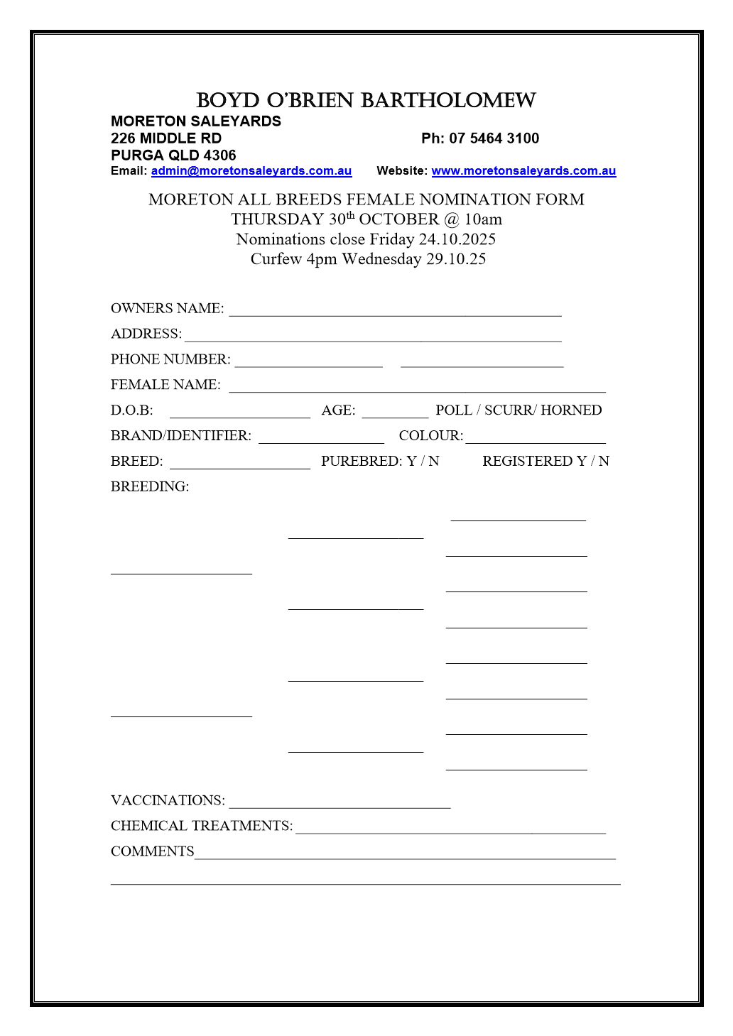 We are holding our annual All Breeds Bull and Female sale again this year on Thursday 30th October 2025. For all enquiries please call your preferred agent. Below is the entry form for you to fill out and return with some photos of of each lot.