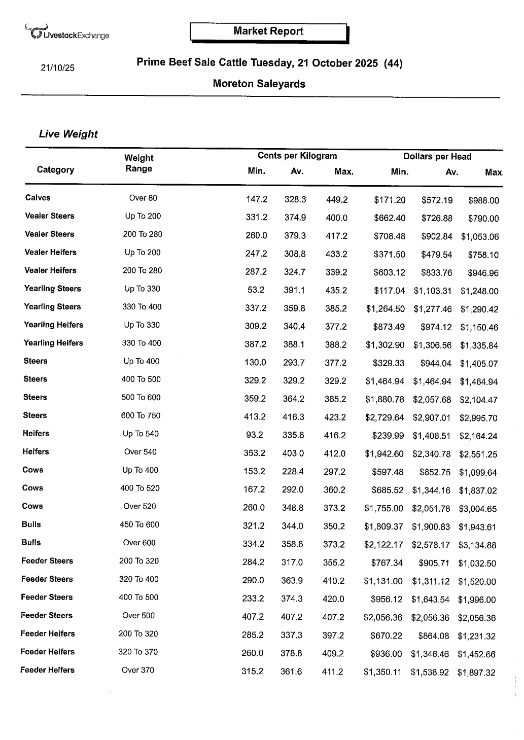 | HEAVY COWS | O'BRIENS TRANSPORT | SANTA | 364.2c/kg - $3004 p/head |