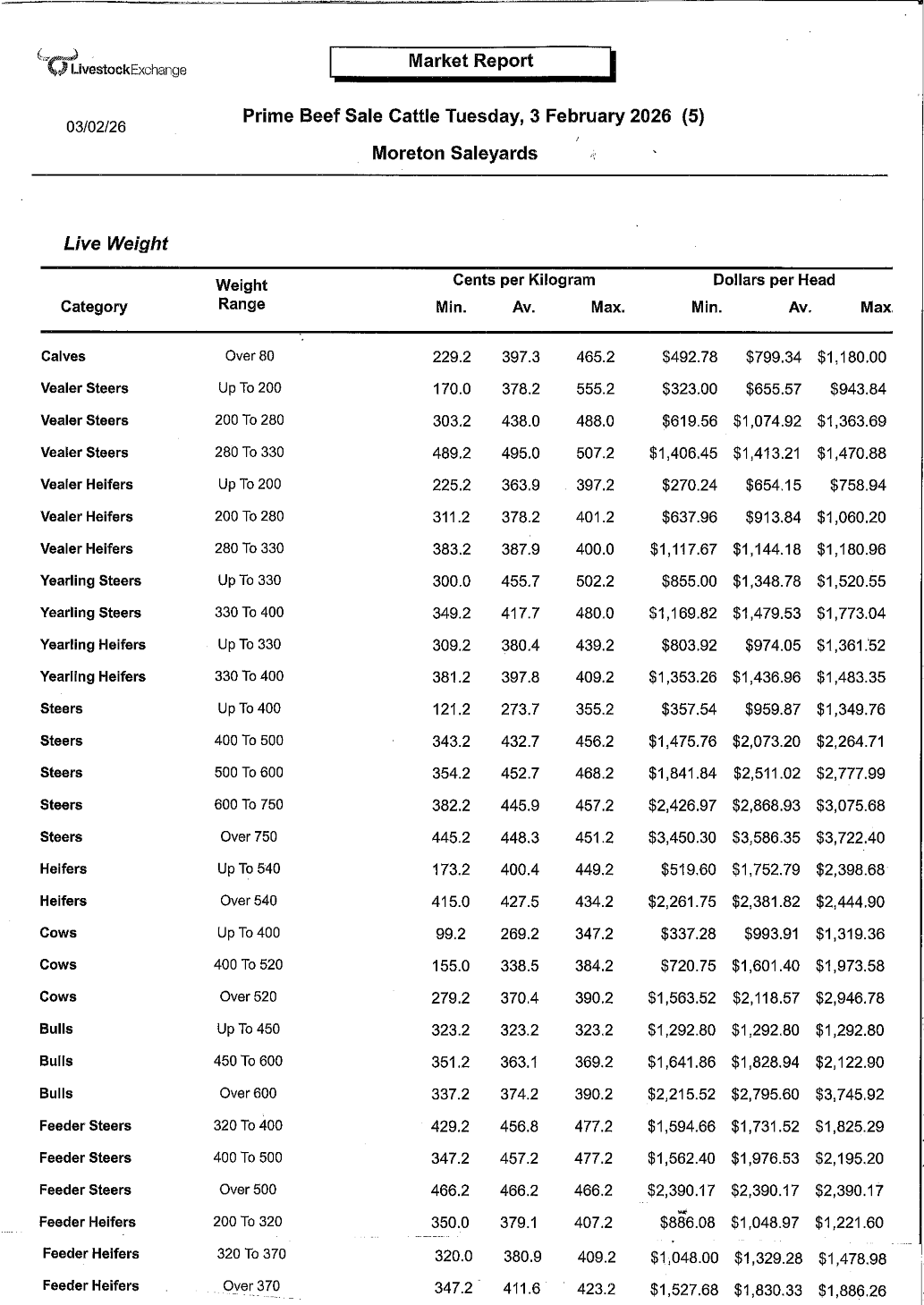 Agents Boyd O’Brien Bartholomew reported a larger yarding of 1103 head of cattle. A large quantity of cows came to hand and sold to strong competition. Heavy steers, ox and trade heifers sold to a fully firm market with all processors operating. Feeder & backgrounding steers still meet a vibrant market with local and western buyers in attendance. Weaner steers and heifers saw fully firm rates with processors and restocker buyers competing well for the choice pens.